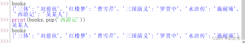 (1)、pop():根据key实现删除,删除的键值对,返回的值是key对应的values