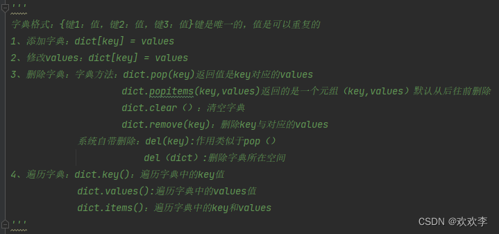 字典的键是唯一的,值是可以重复的;字典没有下标或者切片