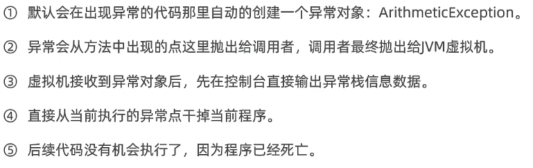 - 异常一旦出现了,如果没有提前处理,程序就会退出JVM虚拟机而终止
