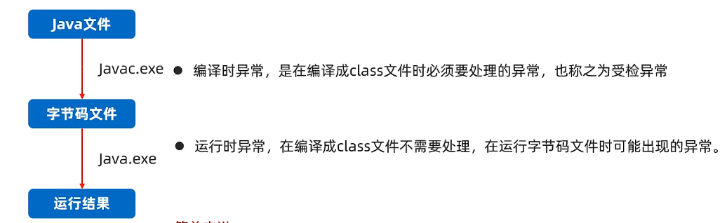 概述:不是RuntimeException或者其子类的异常,编译阶段就会报错,必须处理,否则代码不通过,不能运行。