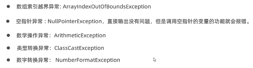 public class ExceptionDemo {public static void main(String[] args) {//数组索引越界异常ArrayIndexOutOfBoundsExceptionint[] arr={1,2,3,4};System.out.println(arr[4]);//下标越界//空指针异常NullPointerException 直接输出没有问题,但是调用空指针的变量的功能就会报错String s=null;System.out.println(s);//不会出现异常,可以直接输出System.out.println(s.length());//字符串s本身都不知道自己指向哪,所以求长度更是不可能的//类型转换异常 ClassCastExceptionObject o=123;String s1=(String) o;//运行错误,程序终止System.out.println(s1);//数学操作异常 ArithmeticExceptionint i=10/0;System.out.println(i);//数字转换异常 NumberFormatExceptionString s2="123aa";Integer ii=Integer.valueOf(s2);System.out.println(ii);}