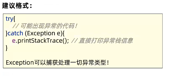public class Exception_02 {public static void main(String[] args) {//建议在最外层try catch一下,就算出现异常程序也不会死亡System.out.println("~~~start");try {chu(10,0);} catch (Exception e) {e.printStackTrace();//打印异常信息}System.out.println("~~~~end");}public static void chu(int a,int b){System.out.println(a);System.out.println(b);int c=a/b;System.out.println(c);}