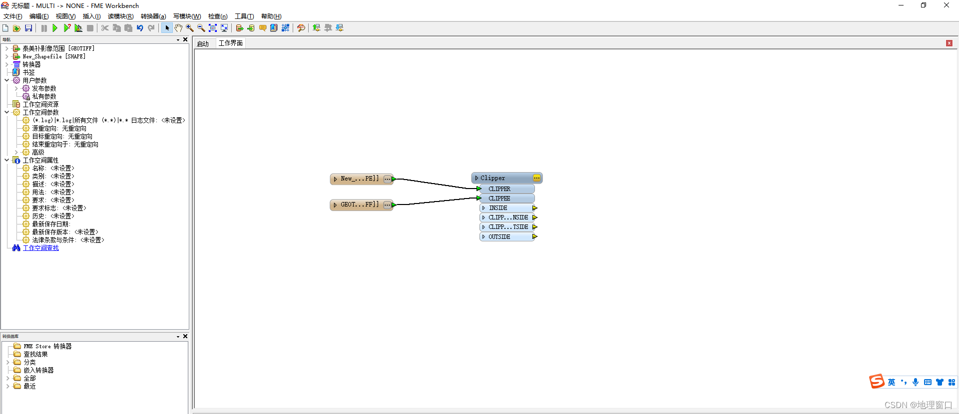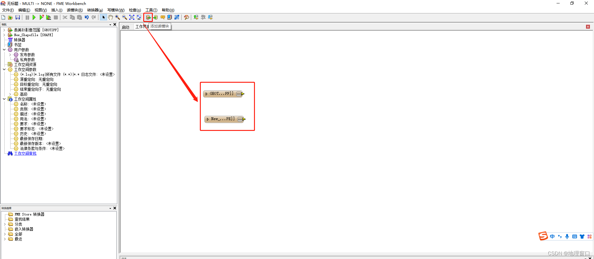 打开FME的Workbench,新建空白工作页面。分别添加两个读模块,用于读取裁剪范围的shp数据和被裁剪的栅格影像数据。
