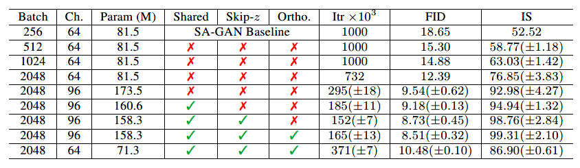 我们首先增加基线模型的批量大小,并立即发现这样做的巨大好处。表1的1-4行表明,简单地将批量大小增加8倍,使得现有技术IS提高了46%。我们推测这是每批次覆盖更多模式的结果,为两个网络提供了更好的梯度。这种缩放的一个值得注意的问题是我们的模型在更少的的迭代中达到更好的最终性能,单边的不稳定并且可能训练崩溃。