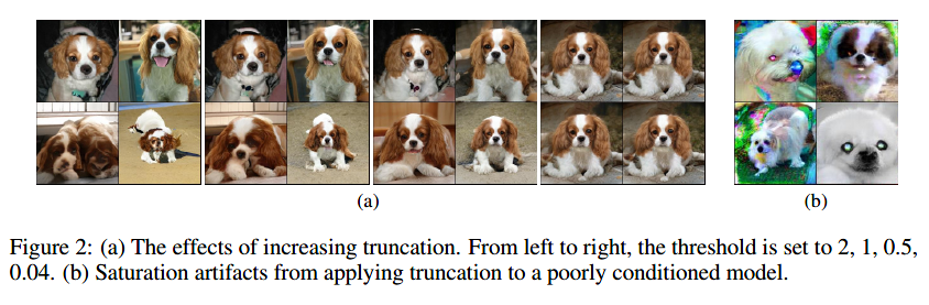 所谓的“截断技巧”就是在对从先验分布 z 采样的过程中,通过设置阈值的方式来截断 z 的采样,超出范围的值被舍弃并且重新采样以落入该范围内。这个阈值可以根据生成质量指标 IS 和 FID 决定。随着截断的阈值下降,生成的质量在提高,但是生成也趋近于单一化。所以根据实验的生成要求,权衡生成质量和生成多样性是一个抉择,往往阈值的下降会带来 IS 的一路上涨,但是 FID 会先变好后一路变差。