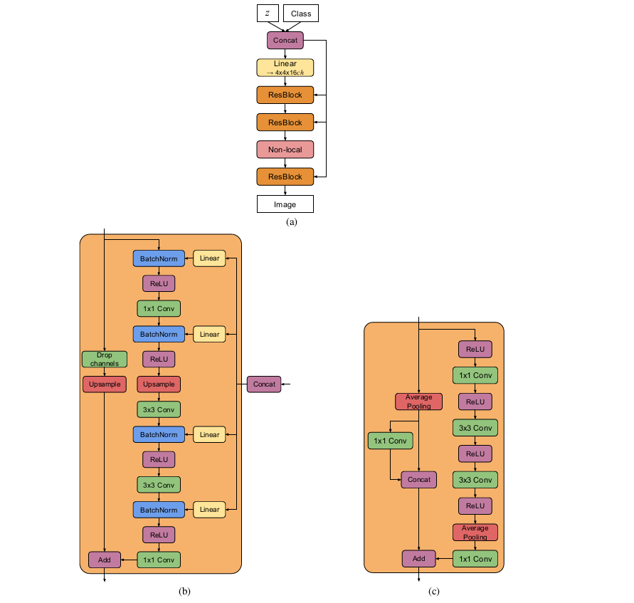 我们注意到用于G中的条件BatchNorm图层的类嵌入c包含大量权重。我们选择使用共享嵌入,而不是为每个嵌入分别设置一个层,这个嵌入会线性投影到每个层的增益和偏差。这降低了计算和内存成本,并将训练速度(达到给定性能所需要的迭代次数)提高了37%。接下来,我们采用分层潜在空间的变体,其中噪声向量z被奎送到G的多个层而不仅仅是初始层。这种设置背后的直觉是允许G使用潜在空间直接影响不同分辨率和层次结构级别的特征。对于我们的架构,通过将在z分成每个分辨率的一个块,并将每个块连接到条件向量c,可以很容易实现这一点,条件向量c被投射到BatchNorm的增益和偏差。