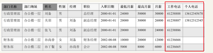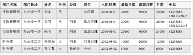 所示表中的每一行数据对应一个员工的信息,包括员工所在的部门、姓名、性别、职位等。显然,这种设计存在以下问题: