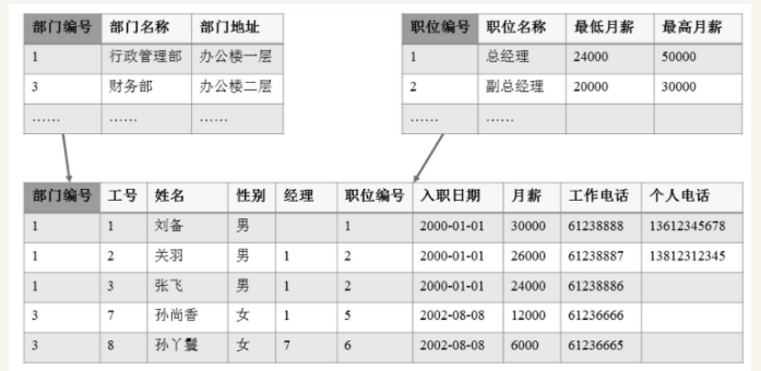 我们将员工信息拆分成了3个表,并且为它们分别增加了一个编号字段。这是因为姓名、部门名称、职位名称等信息并不适合作为主键。例如,当我们使用部门名称作为主键时,如果需要修改某个部门的名称,员工表中就需要相应地修改多条记录。通常我们可以为每个表增加一个与业务无关的字段作为主键。