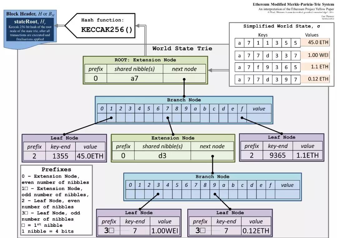 MPT是前缀树结构,树中的每个叶子节点允许有最多16个子叶子节点,叶子节点有一个HASH字段,由该叶子的所有子叶子节点HASH运算得出。树根有唯一的HASH值,标识整棵树的HASH。