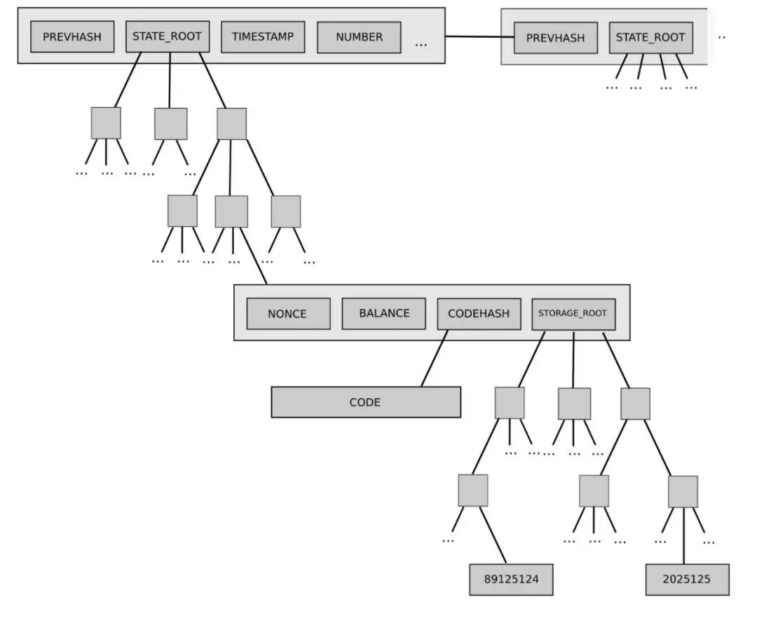 以太坊的全局状态数据,保存在MPT树中,状态数据由账号组成。账号在MPT中是一个叶子节点,账号数据包括Nonce、Balance、CodeHash和StorageRoot。任意一个账号字段发生变化时,会导致该账号所在的叶子的HASH发生变化,从该叶子直到顶部的所有叶子的HASH都会变化,最后导致顶部的StateRoot变化。