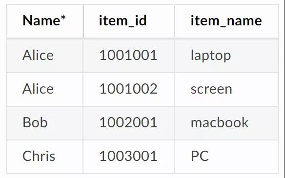 Table中以Name为主key,存有3个Entries对象。第1个Entries中存有Alice的2条记录,第2个Entries中存有Bob的1条记录,第3个Entries中存有Chris的一条记录。