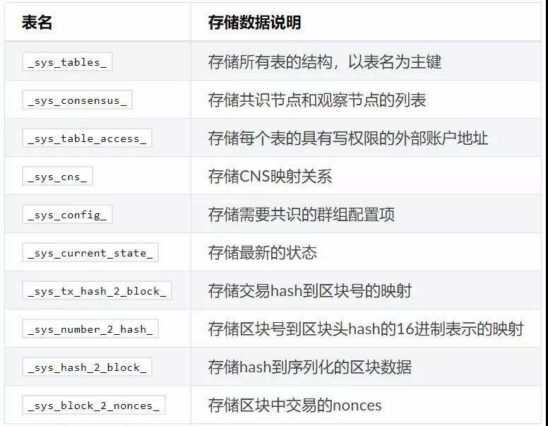 抽象了分布式存储的类SQL接口,由State层和Precompiled调用。分布式存储层抽象了存储的增删改查接口,把区块链的核心数据分类存储到不同的表中。