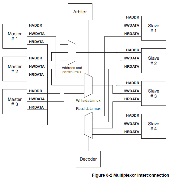 AMBA AHB 总线协议设计使用一个中央多路选择器互联方案。该方案中,所有总线主机设备输出地址和控制信号来指示它们想执行的传输,同时仲裁器决定哪一个主机能够将它