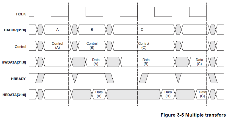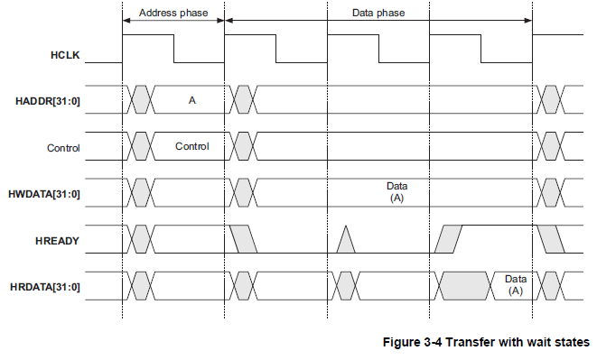 如果是写操作,主机要在等待期间保持写数据不变,直到本次传输完成;如果是读操作,从机不需要一开始就给出数据,仅当HREADY拉高后才给出有效数据。