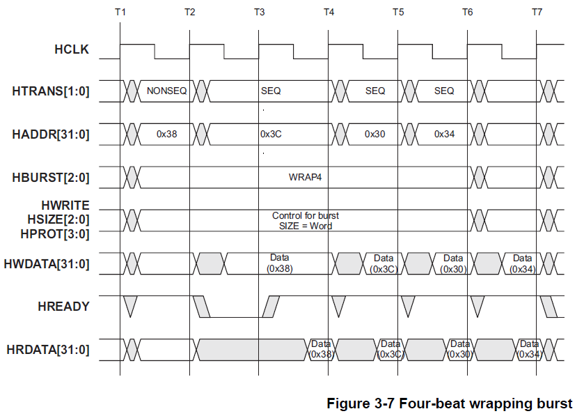作为一次四拍字突发传输,地址将会在 16 字节边界回环,因此传输到地址 0x3C之后接下来传输的地址是 0x30。 下图表示了(回环突发)和增量突发的唯一不同,既是地址连续通过了 16 字节边界,并不回环,而是递增。