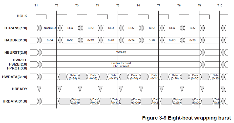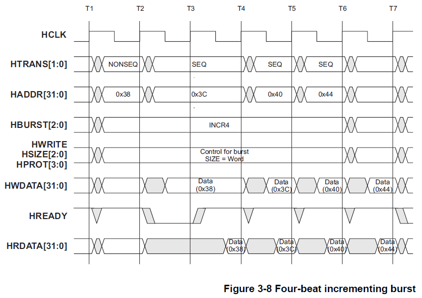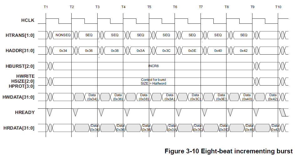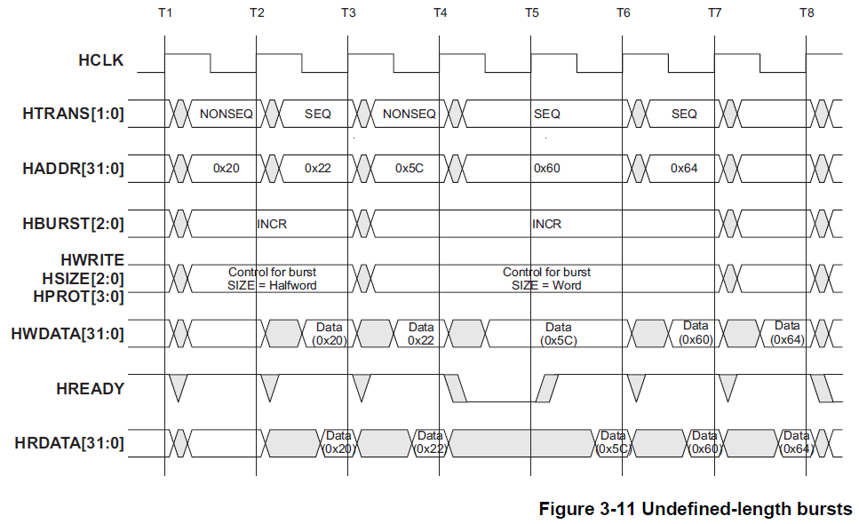 AMBA AHB 协议定义了 4、8 和 16 拍突发,也有未定长度的突发和信号传输。协议支持增量和回环操作: