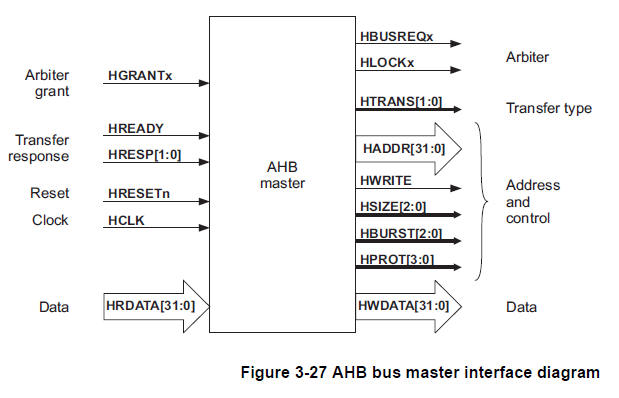 AHB 主机:总线主机能够通过提供地址和控制信息发起读写操作。任何时候只允许一个总线主机处于有效状态并能使用总线。
