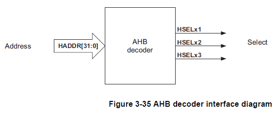 AHB 译码器:AHB 译码器用来对每次传输进行地址译码并且在传输中包含一个从机选择信号。所有 AHB 执行都必须仅要求有一个中央译码器。