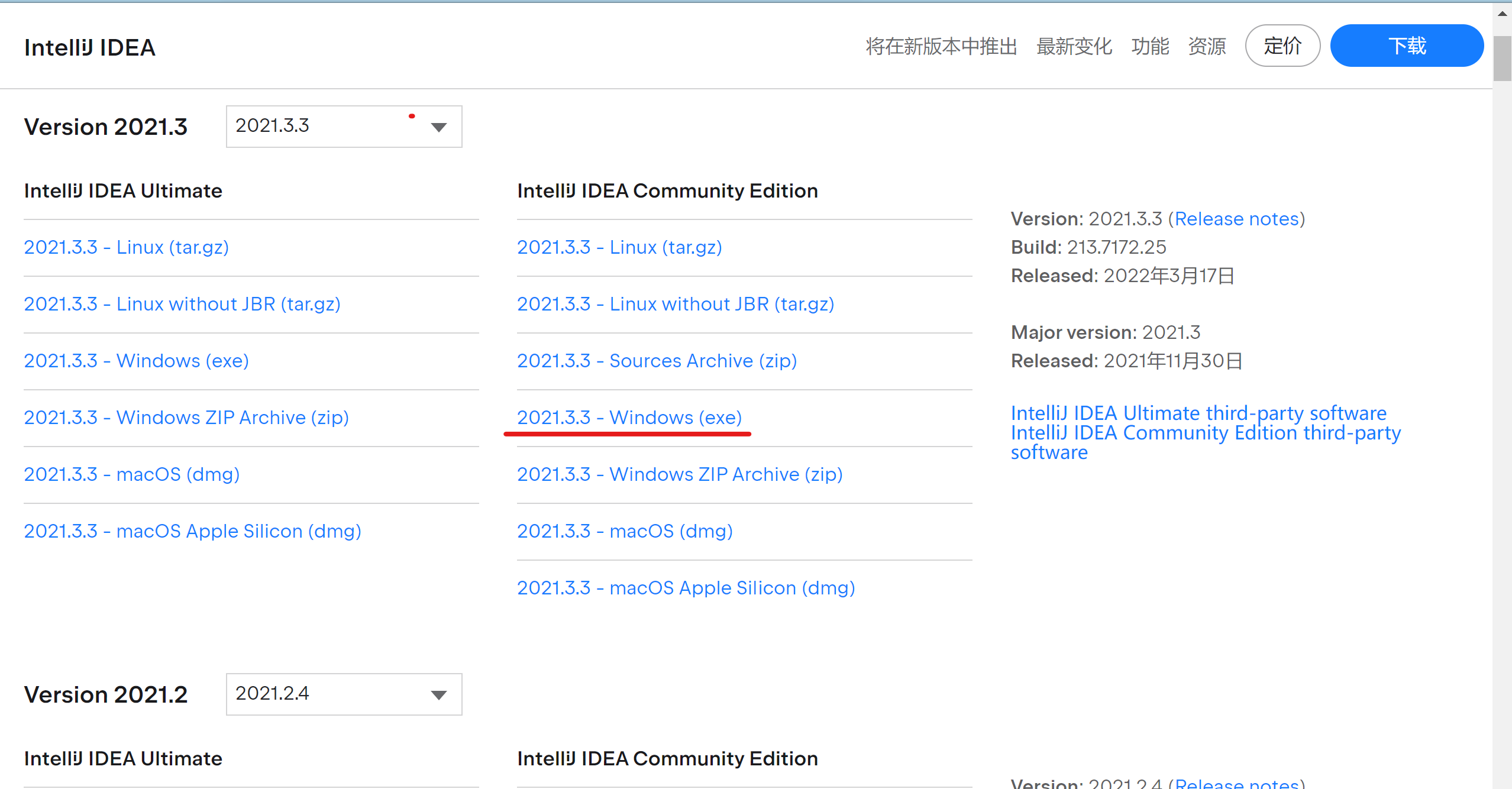 注意:一般来说,学习阶段选择Community(社区版)下的文件下载就行。(因为我自己每次下在各种软件总是想着下载最新功能最全的,但是每次点进官网就是一大堆的英文和各种版本的软件)