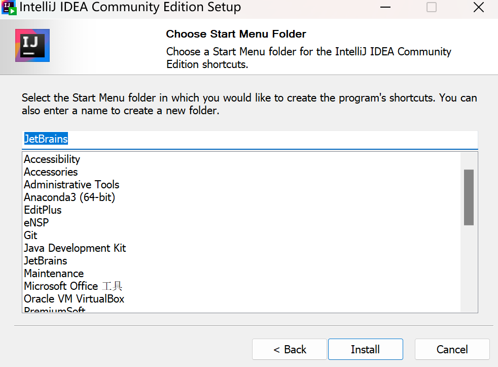 Next 选择开始菜单文件夹后,点击 Install 等待安装。如图 所示