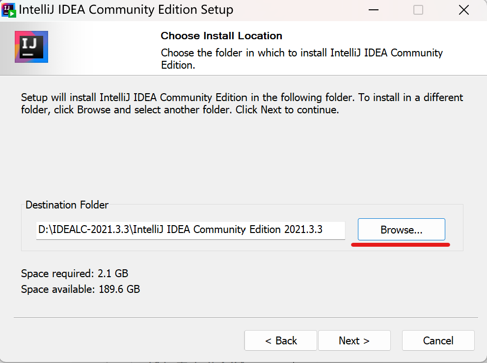 设置 IDEA 的安装目录(点击Browse...选择D盘自己新建的文件夹),建议不要安装在 C 盘,这里选择安装到 D 盘(自己在D盘新建一个文件夹)