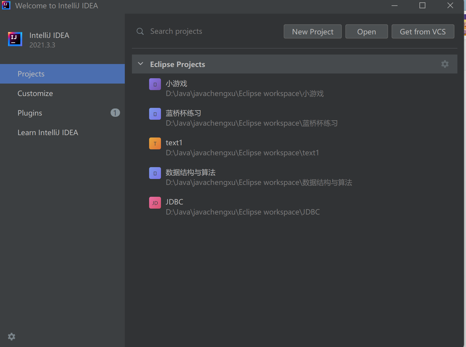 注意:若之前是使用Eclipse 写代码的该处会显示出可直接点击进入之前写的Projects.