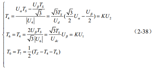 在传统 SVPWM 算法如式(2-34)中用到了空间角度及三角函数,使得直接计算基本电压矢量作用时间变得十分困难。实际上,只要充分利用 Uα 和 Uβ 就可以使计算大为简化。