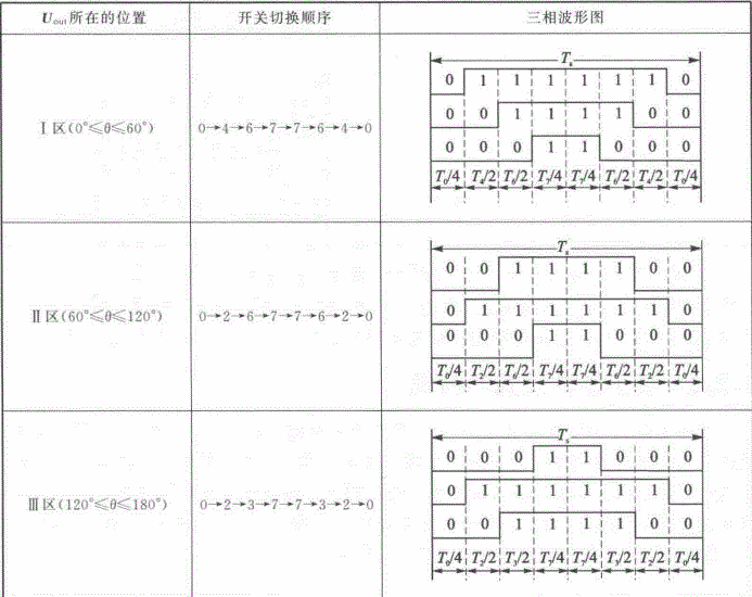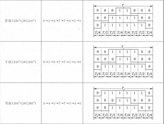 以第Ⅰ扇区为例,其所产生的三相波调制波形在一个载波周期时间Ts内如图 2-11 所示,图中电压向量出现的先后顺序为 U0、U4、U6、U7、U6、U4、U0,各电压向量的三相波形则与表 2-2 中的开关表示符号相对应。再下一个 载波周期Ts ,Uref 的角度增加一个γ,利用式(2-33)可以重新计算新的 T0、T4、T6 及 T7 值,得到新的类似图 2-11 的合成三相波形;这样每一个载波周期 TS 就会合成一个新的矢量,随着 θ 的逐渐增大,Uref 将依序进入第Ⅰ、Ⅱ、Ⅲ、Ⅳ、Ⅴ、Ⅵ区。在电压向量旋转一周期后,就会产生 R 个合成矢量。