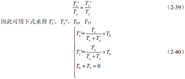 设将电压矢量端点轨迹端点拉回至正六边形内切圆内时两非零矢量作用时间分别为 Tx',Ty',则有比例关系: