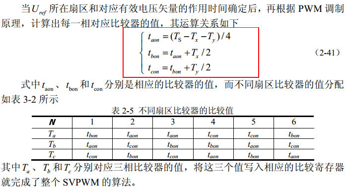 到这里,FOC与SVPWM的对接就变成了,先根据N=4*C+2*B+A判断合成矢量所在扇区,然后查表2-4得出两非零矢量的作用时间,最后得出三相开关管PWM波的占空比,查表让算法更高效。