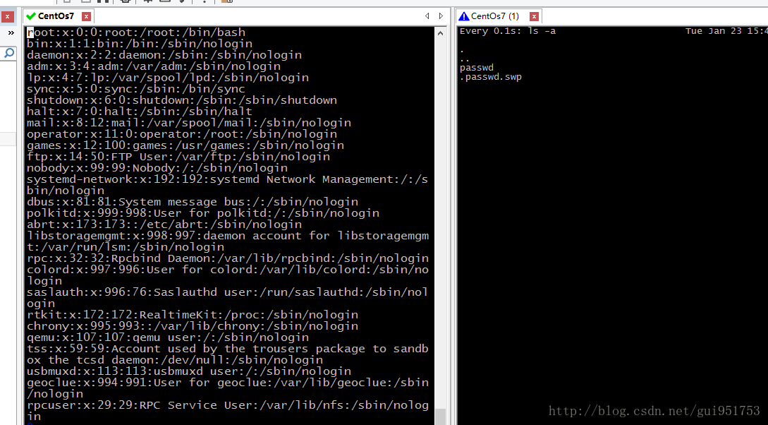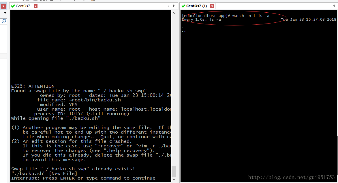 第一步,我们同时开两个窗口,右测窗口使用,watch -n 1 ls -a 命令,表示,每间隔1秒刷新一下ls命令的执行结果。