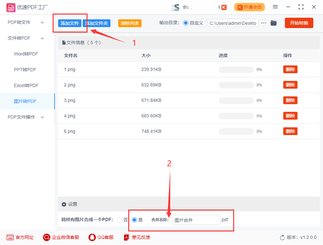 步骤2,点击左上角【添加文件】蓝色按钮,将需要合并成pdf的图片导入到软件中。将所有图片合成一个PDF右边选择“是”,再设置合成后pdf文件的名称。