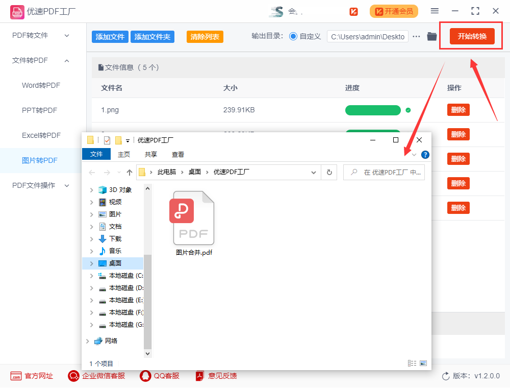 步骤3,完成设置后,点击右上角的【开始转换】按钮启动软件,当所有图片合并转成pdf后软件会自动打开输出文件夹,合并成的pdf文件就保存在这里,方便我们查看。