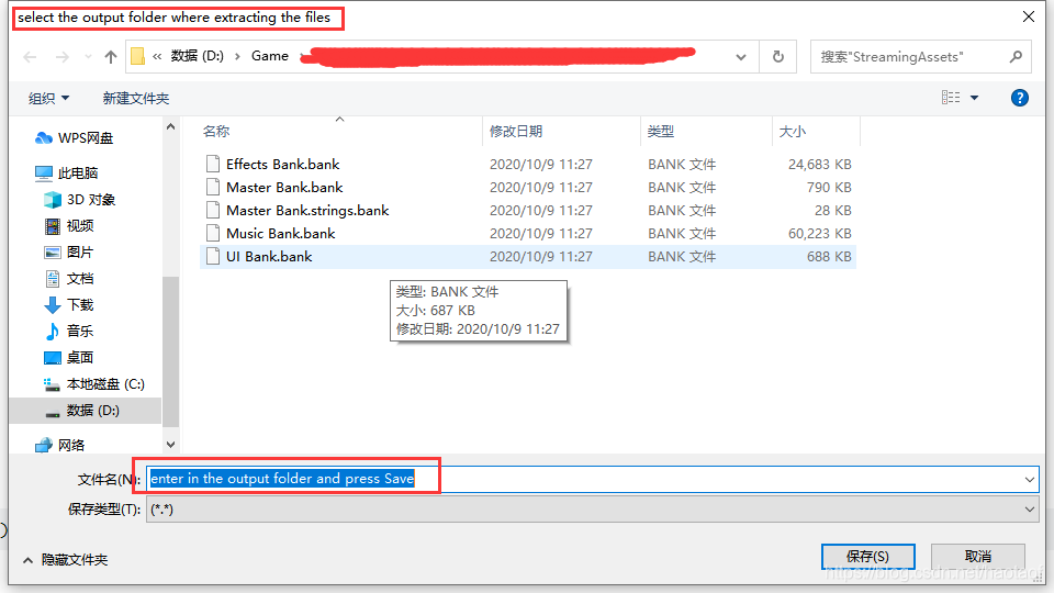 4.选择需要提取音效的目标.bank文件,弹出导出位置,这个时候导出一个00000000.fsb的文件