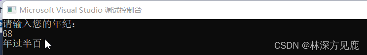 {int age=18;printf("请输入您的年纪:\n");scanf("%d", &age);if (age < 18)printf("未成年\n");else if (age >= 18 && age < 30)printf("青年\n");else if (age >= 30 && age < 50)printf("中年\n");else if (age >= 50 && age < 70)printf("年过半百\n");else if (age >= 70 && age < 200)printf("老年\n");elseprintf("输入年纪错误,请重新输入:\n");return 0;