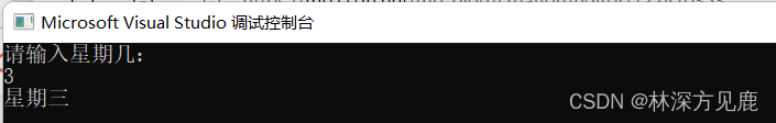 {int day;printf("请输入星期几:\n");scanf("%d", &day);switch (day){case(1):printf("星期一\n");break;case(2):printf("星期二\n");break;case(3):printf("星期三\n");break;case(4):printf("星期四\n");break;case(5):printf("星期五\n");break;case(6):printf("星期六\n");break;case(7):printf("星期日\n");break;}return 0;