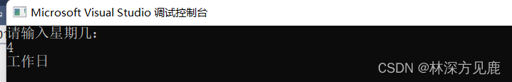 {int day;printf("请输入星期几:\n");scanf("%d", &day);switch (day){case(1):case(2):case(3):case(4):case(5):printf("工作日\n");break;case(6):case(7):printf("休息日\n");break;default:printf("输入错误,请重新输入:\n");break;}return 0;