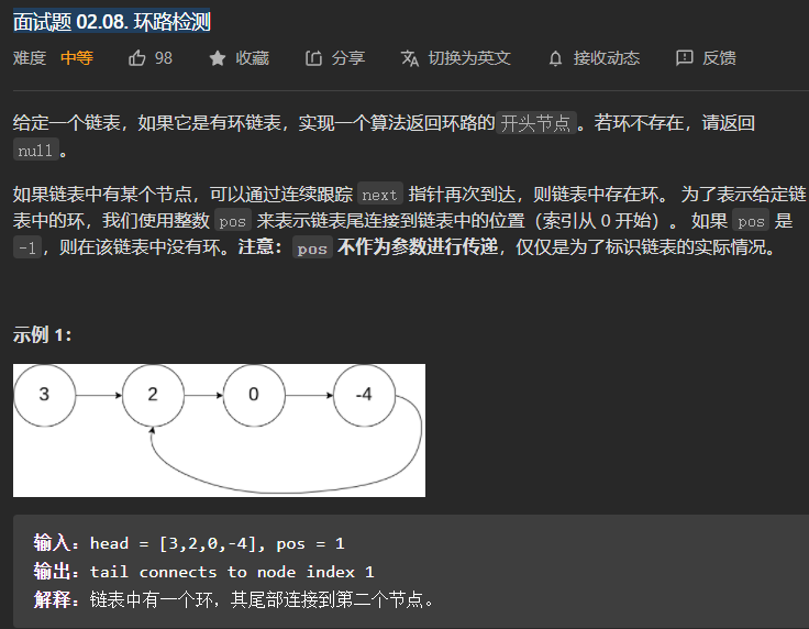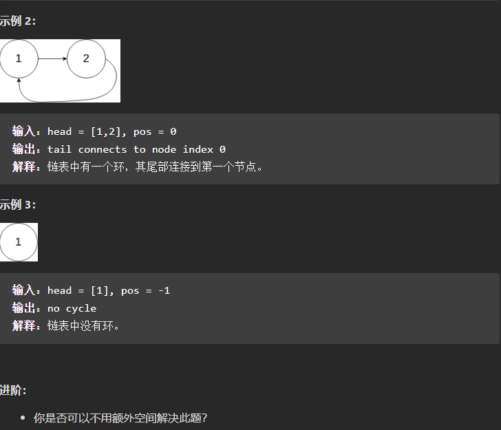 public class Solution {public ListNode detectCycle(ListNode head) {// 时间O(n)// 空间O(1),这里使用的是三个指针,不占用空间ListNode slow = new ListNode(-1), fast = new ListNode(-1);slow = head;fast = head;while(fast != null){if(fast.next != null && fast.next.next != null){fast = fast.next.next;}elsereturn null;slow = slow.next;if(slow == fast){ //代表有循环// 找到环的入口ListNode temp = head;while(temp != slow){temp = temp.next;slow = slow.next;}return temp;}}return null;}