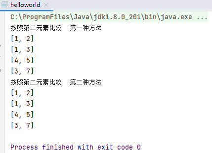 import java.util.Comparator;public class helloworld {public static void main(String[] args) {int[][] a1=new int[][]{{1,3},{1,2},{4,5},{3,7}};int[][] a2=new int[][]{{1,3},{1,2},{4,5},{3,7}};Arrays.sort(a1, new Comparator<int[]>() {@Overridepublic int compare(int[] o1, int[] o2) {return o1[1]-o2[1];}});System.out.println("按照第二元素比较 第一种方法");for (int i = 0; i < a1.length; i++) {System.out.println(Arrays.toString(a1[i]));}Arrays.sort(a2,(a, b)->(a[1]-b[1]));System.out.println("按照第二元素比较 第二种方法");for (int i = 0; i < a1.length; i++) {System.out.println(Arrays.toString(a2[i]));}}