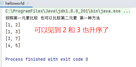 import java.util.Comparator;public class helloworld {public static void main(String[] args) {int[][] a1=new int[][]{{1,3},{1,2},{4,5},{3,7}};int[][] a2=new int[][]{{1,3},{1,2},{4,5},{3,7}};Arrays.sort(a1, new Comparator<int[]>() {@Overridepublic int compare(int[] o1, int[] o2) {if(o1[0]==o2[0]){return o1[1]-o2[1];}return o1[0]-o2[0];}});System.out.println("按照第一元素比较 也可以比较第二元素 第一种方法");for (int i = 0; i < a1.length; i++) {System.out.println(Arrays.toString(a1[i]));}// Arrays.sort(a2,(a, b)->(a[0]-b[0]));