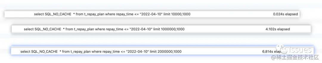 随着逐渐的数据偏移,数据耗时逐渐增加。因为这种深度分页是将数据全部查询出来,并且抛弃掉,效果自然不是那么尽如人意