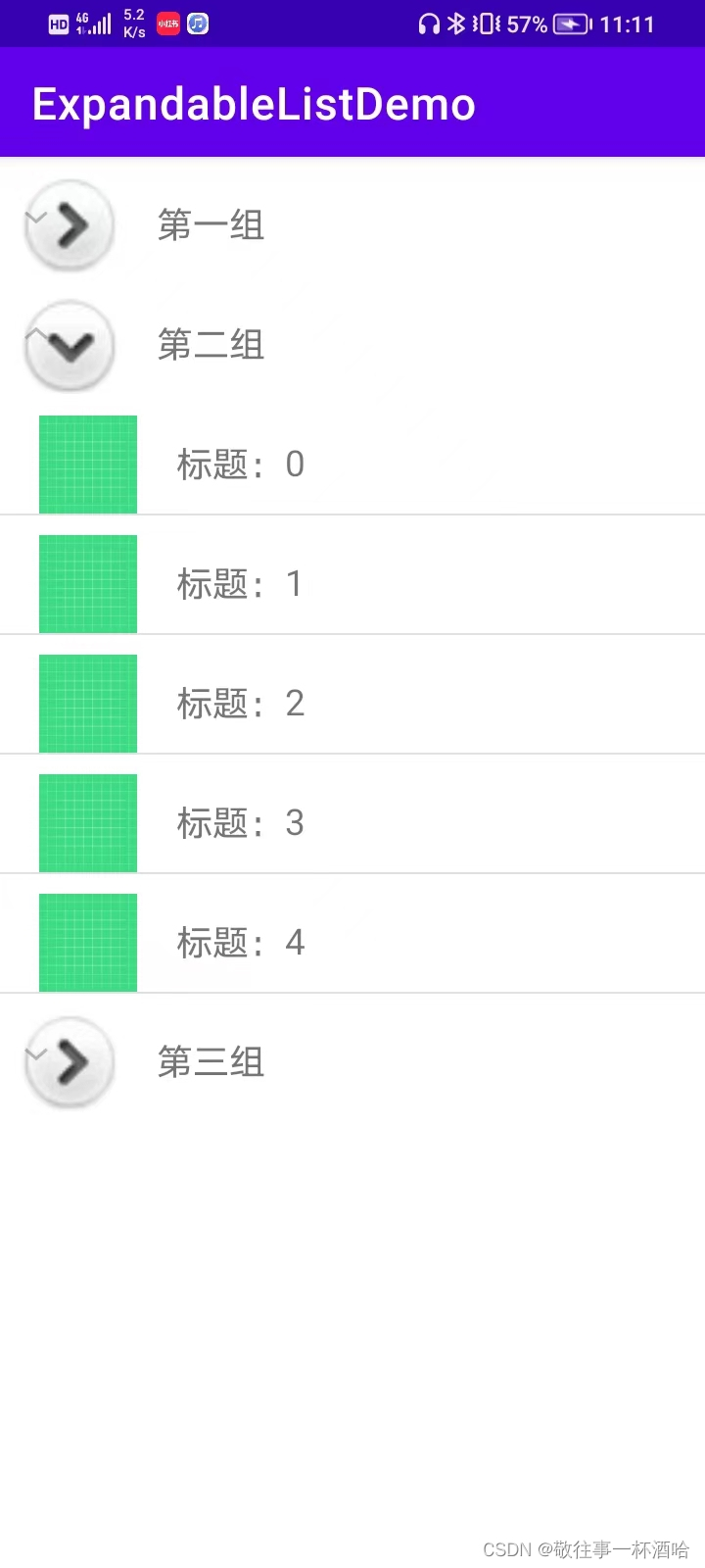 import java.util.Map;public class MainActivity extends AppCompatActivity {private ExpandableListView expandList;private List<String> groupData;//group的数据源private Map<Integer, List<ChildItem>> childData;//child的数据源private MyAdapter myAdapter;final int CONTEXT_MENU_GROUP_DELETE = 0;//添加上下文菜单时每一个菜单项的item IDfinal int CONTEXT_MENU_GROUP_RENAME = 1;final int CONTEXT_MENU_CHILD_EDIT = 2;final int CONTEXT_MENU_CHILD_DELETE = 3;@Overrideprotected void onCreate(Bundle savedInstanceState) {super.onCreate(savedInstanceState);setContentView(R.layout.activity_main);initData();initView();}private void initData() {groupData = new ArrayList<>();groupData.add("第一组");groupData.add("第二组");groupData.add("第三组");List<ChildItem> childItems = new ArrayList<>();for (int i = 0; i < 10; i++) {ChildItem childData = new ChildItem("标题:"+i, R.drawable.ic_launcher_background);childItems.add(childData);}List<ChildItem> childItems2 = new ArrayList<ChildItem>();for (int i = 0; i < 5; i++) {ChildItem childData1 = new ChildItem("标题:"+i, R.drawable.ic_launcher_background);childItems2.add(childData1);}List<ChildItem> childItems3 = new ArrayList<ChildItem>();for (int i = 0; i < 2; i++) {ChildItem childData1 = new ChildItem("标题:"+i, R.drawable.ic_launcher_background);childItems3.add(childData1);}childData = new HashMap<Integer, List<ChildItem>>();childData.put(0, childItems);childData.put(1, childItems2);childData.put(2, childItems3);myAdapter = new MyAdapter(this, groupData, childData);}private void initView() {expandList = findViewById(R.id.expandlist);expandList.setAdapter(myAdapter);// 添加上下文的菜单registerForContextMenu(expandList);// 给子项添加点击事件expandList.setOnChildClickListener(new ExpandableListView.OnChildClickListener() {@Overridepublic boolean onChildClick(ExpandableListView parent, View v, int groupPosition, int childPosition, long id) {Toast.makeText(MainActivity.this, "你单击了:"+myAdapter.getChild(groupPosition, childPosition), Toast.LENGTH_SHORT).show();return true;}});}/** 添加上下文菜单*/@Overridepublic void onCreateContextMenu(ContextMenu menu, View v,ContextMenu.ContextMenuInfo menuInfo) {super.onCreateContextMenu(menu, v, menuInfo);ExpandableListView.ExpandableListContextMenuInfo info = (ExpandableListView.ExpandableListContextMenuInfo)menuInfo;int type = ExpandableListView.getPackedPositionType(info.packedPosition);if (type == ExpandableListView.PACKED_POSITION_TYPE_GROUP) {menu.setHeaderTitle("Options");menu.add(0, CONTEXT_MENU_GROUP_DELETE, 0, "删除");menu.add(0, CONTEXT_MENU_GROUP_RENAME, 0, "重命名");}if (type == ExpandableListView.PACKED_POSITION_TYPE_CHILD) {menu.setHeaderTitle("Options");menu.add(1, CONTEXT_MENU_CHILD_EDIT, 0, "编辑");menu.add(1, CONTEXT_MENU_CHILD_DELETE, 0, "删除");}}/** 每个菜单项的具体点击事件*/@Overridepublic boolean onContextItemSelected(MenuItem item) {ExpandableListView.ExpandableListContextMenuInfo info = (ExpandableListView.ExpandableListContextMenuInfo)item.getMenuInfo();switch (item.getItemId()) {case CONTEXT_MENU_GROUP_DELETE:Toast.makeText(this, "这是group的删除", Toast.LENGTH_SHORT).show();break;case CONTEXT_MENU_GROUP_RENAME:Toast.makeText(this, "这是group的重命名", Toast.LENGTH_SHORT).show();break;case CONTEXT_MENU_CHILD_EDIT:Toast.makeText(this, "这是child的编辑", Toast.LENGTH_SHORT).show();break;case CONTEXT_MENU_CHILD_DELETE:Toast.makeText(this, "这是child的删除", Toast.LENGTH_SHORT).show();break;default:break;}return super.onContextItemSelected(item);}
