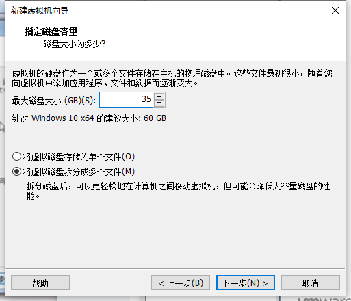 6.这一步,因为是虚拟机,不需要太多硬盘空间,win10大约35G以上,win7大约30G以上,winXp大约25G以上。
