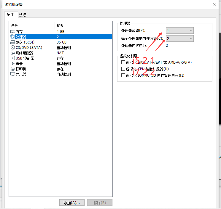 处理器:如果4核,处理器数量选2;如果8核,处理器数量选择4