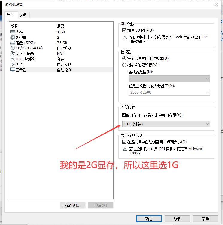 显示器,WIN+R,输入dxdiag,点确定,找打“显示”,可以看到显存。将虚拟机显存调味本机的一半。