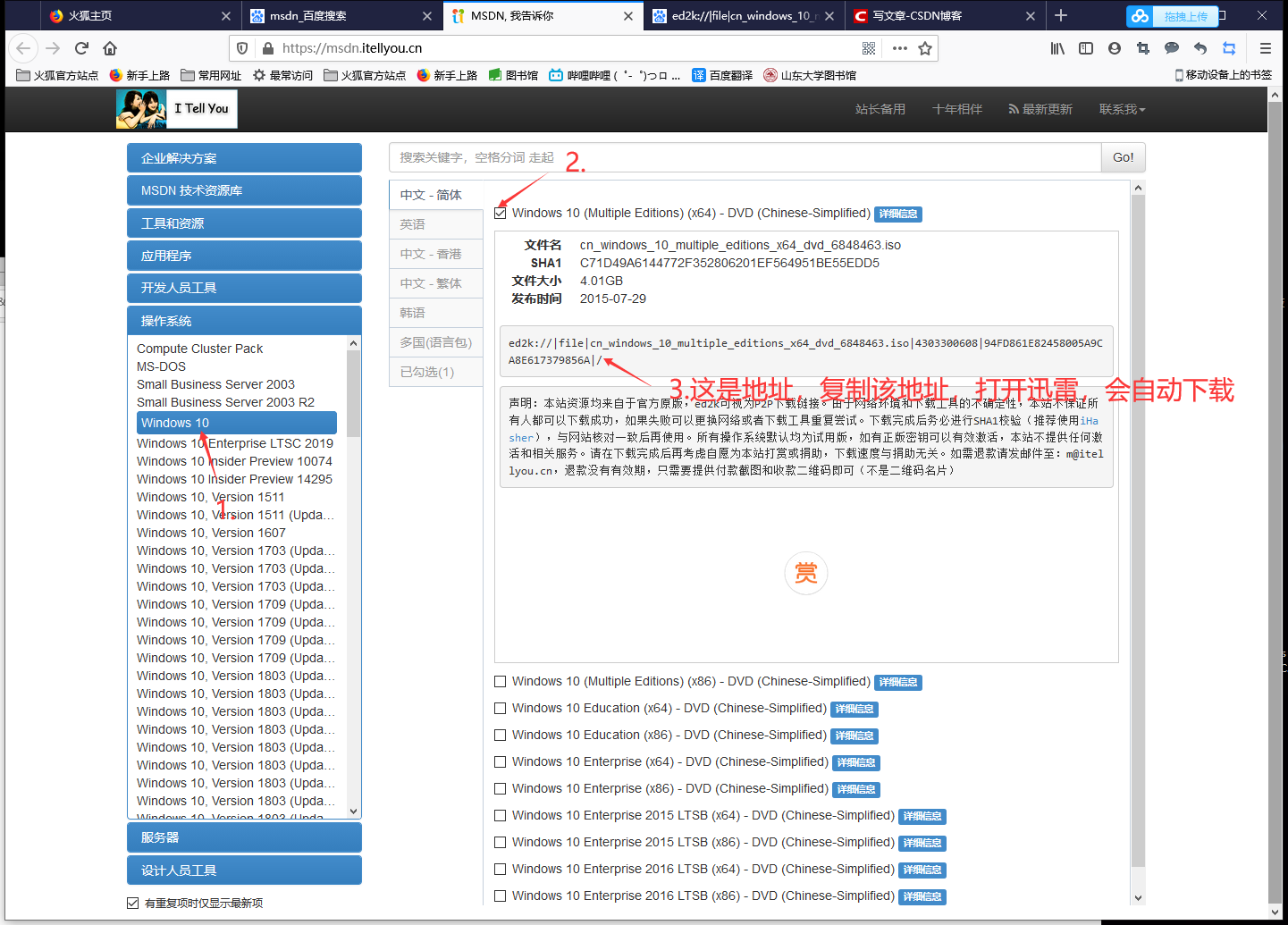 8.百度搜索“msdn”,进入“我告诉你网站”,找到操作系统,复制地址,打开迅雷进行下载