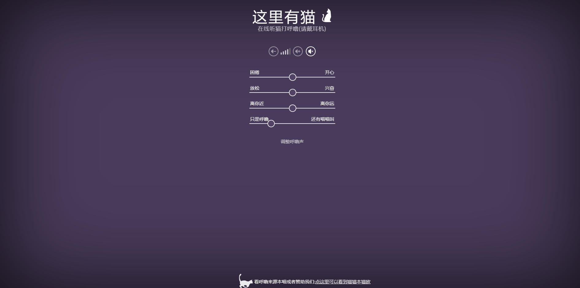 一个可以在线听猫声音的网站,自己可以调整猫咪的状态,比如是困倦的还是开心的,是放松的还是兴奋地,是离你近的还是远的,是只是呼噜还是喵喵叫的声音。