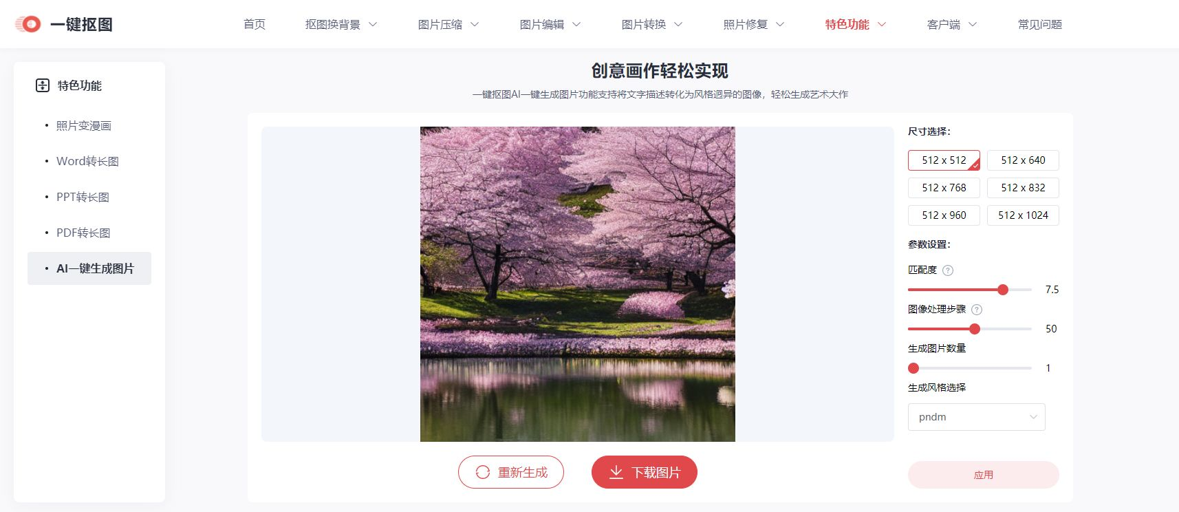 一个免费的AI绘画在线工具,不需要注册登录,打开之后直接输入关键词描述就可以快速生成图片,还可以上传参考图片,生成之后可以调整图片尺寸、匹配度、生成数量等参数。