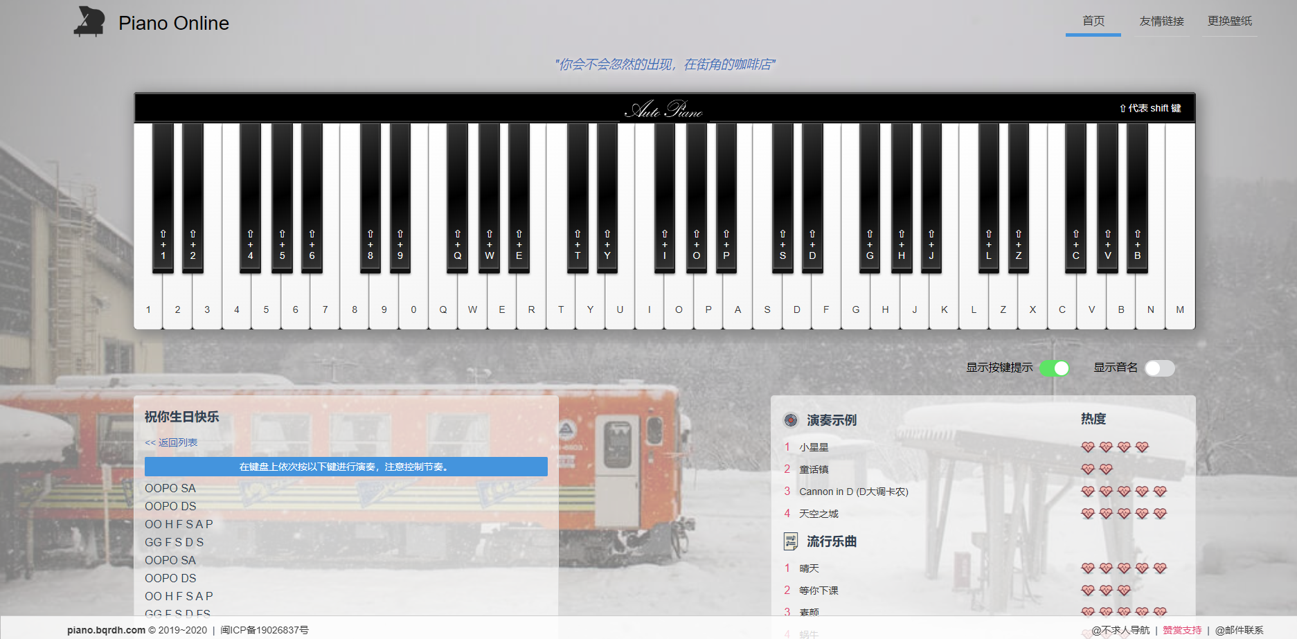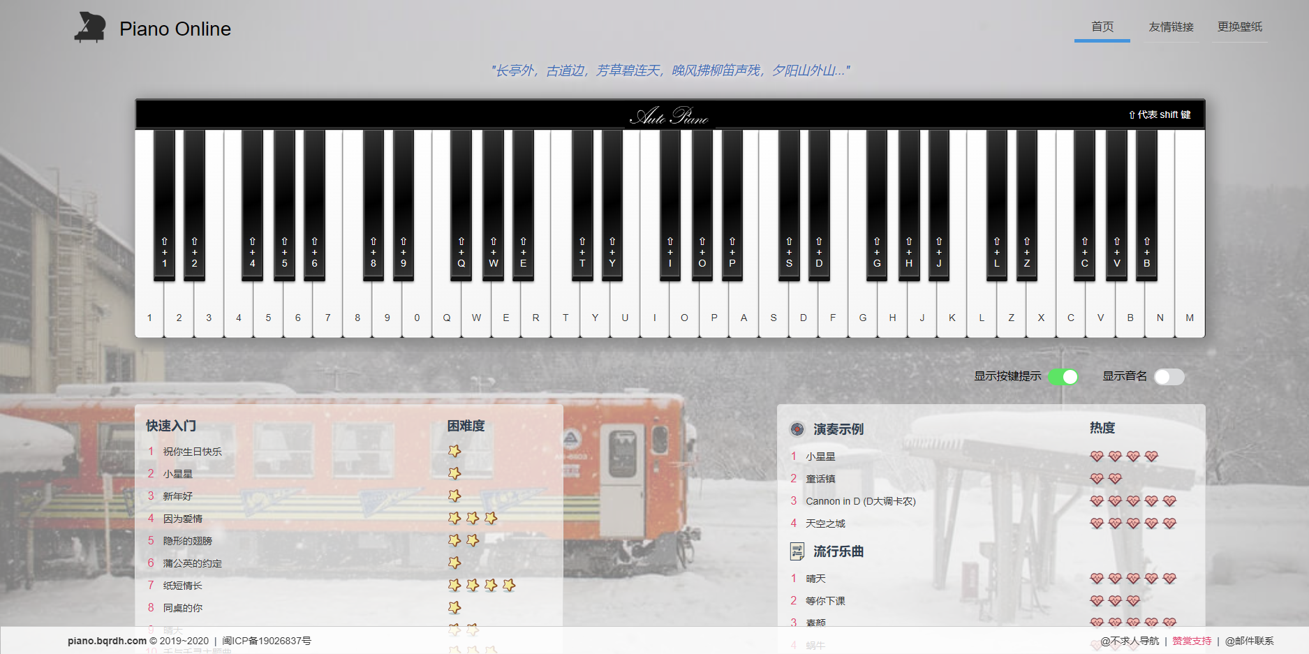 一个可以在线弹钢琴的网站,琴键上标注了对应的字母,在键盘上点击字母就会发出对应琴键的声音,或者鼠标点击也能发出声音,不过用键盘弹的话更有感觉。