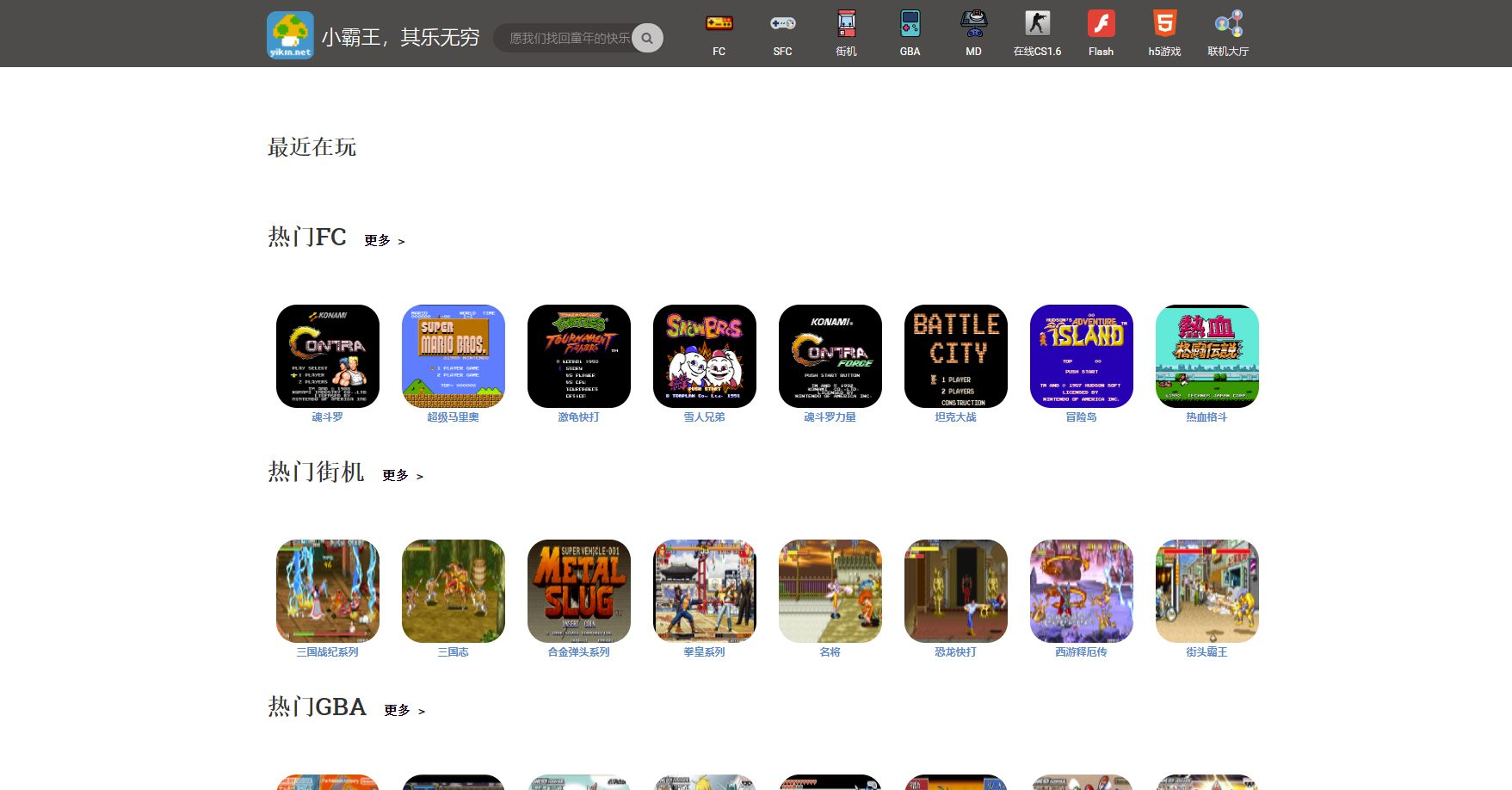 一个充满童年回忆的在线游戏网站,里面汇集了很多童年游戏,比如有魂斗罗,超级玛丽,热血足球,三国志,合金弹头,拳皇等等。